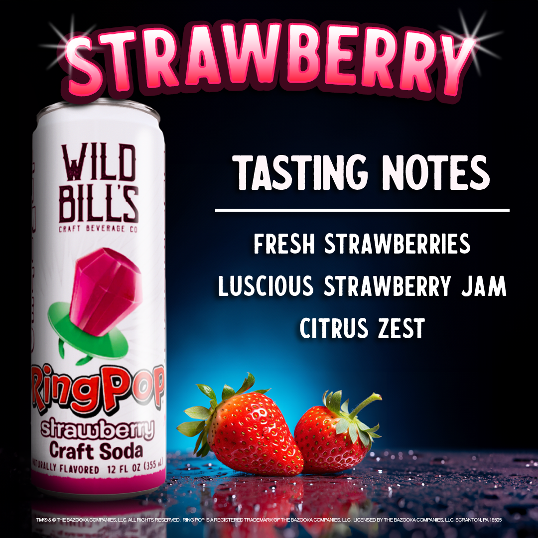 Wild Bill’s – Ring Pop Strawberry (12 oz) Pure Cane Sugar | Caffeine-Free | Gluten-Free | Vegan Sweet, Nostalgic, and Bursting with Classic Flavor Flavor Description: Relish the classic sweetness of Ring Pop Strawberry—like sipping straight from a sun-kissed strawberry patch from your childhood. Pure nostalgia in every can! Tasting Notes: - Fresh Strawberries - Luscious Strawberry Jam - Citrus Zest Perfect Pairing: Pair it with strawberry shortcake topped with vanilla bean ice cream and a drizzle of warm caramel. The soda’s strawberry notes elevate this dessert to pure indulgence. Veteran-Owned & Operated Wild Bill’s proudly supports veterans by helping their transition from military to civilian life through nonprofit partnerships, discounted franchise fees, and meaningful employment. Real Brand. Real History. For over 20 years, Wild Bill’s has delighted over a million customers nationwide with Wild West-themed pop-up retail at fairs, festivals, and conventions.
